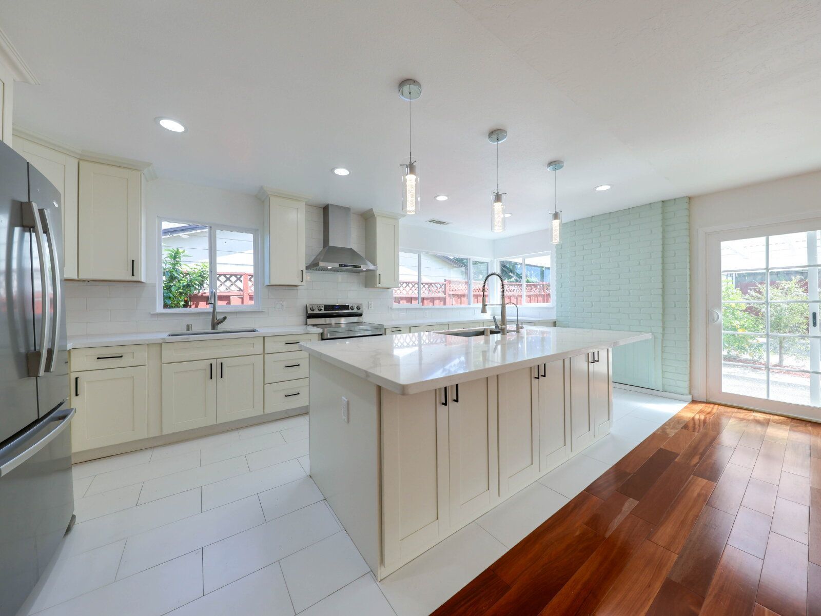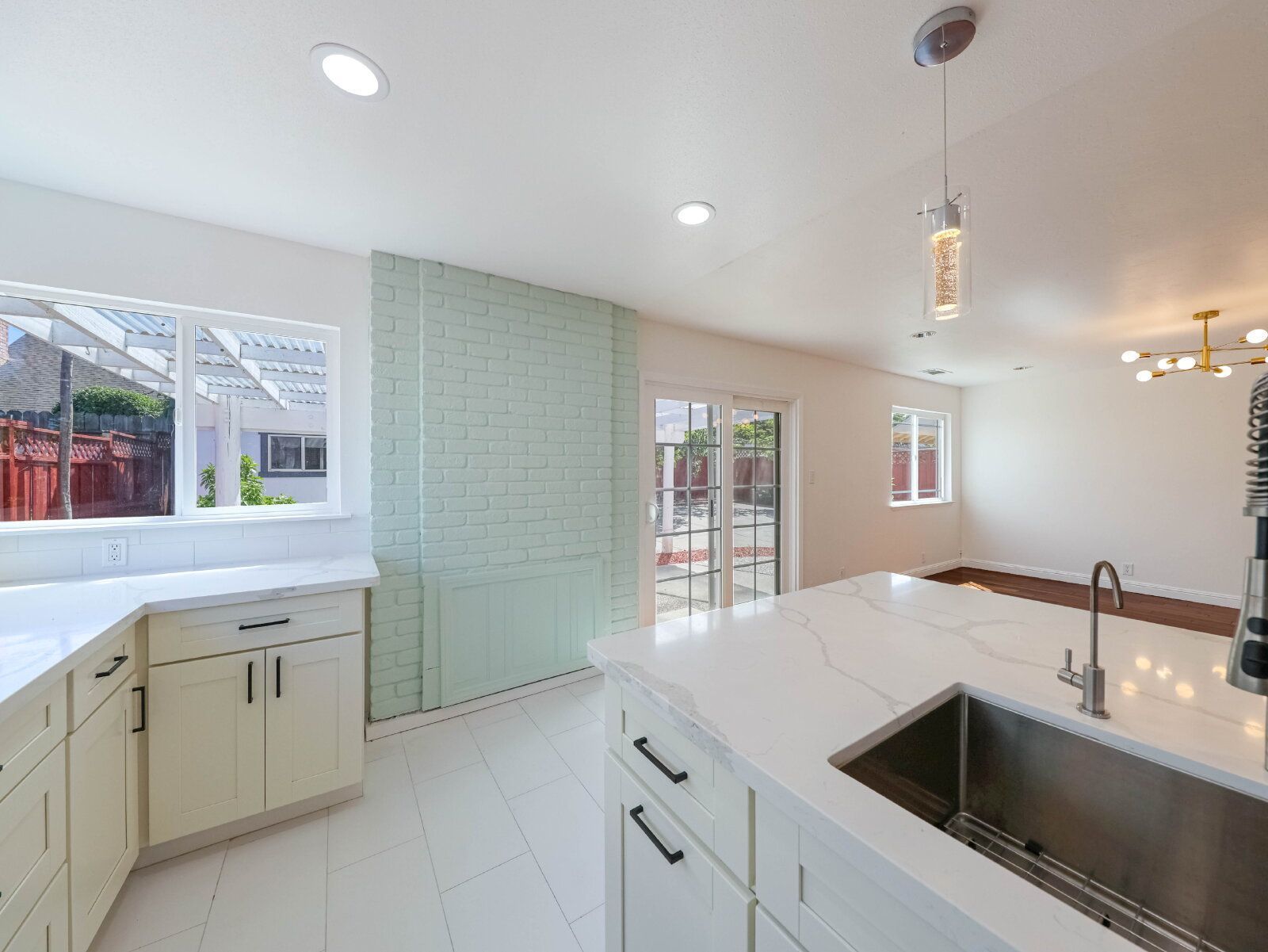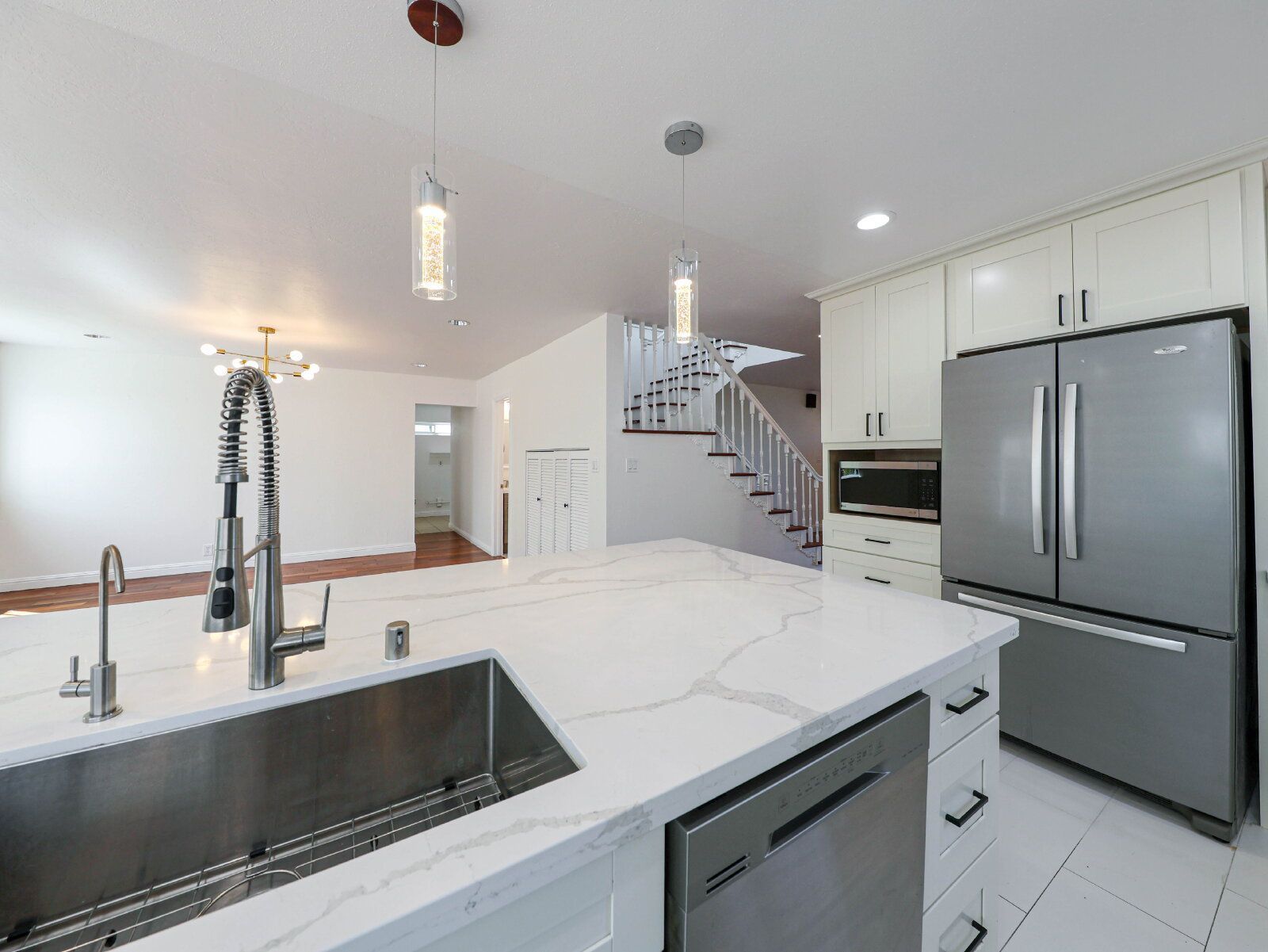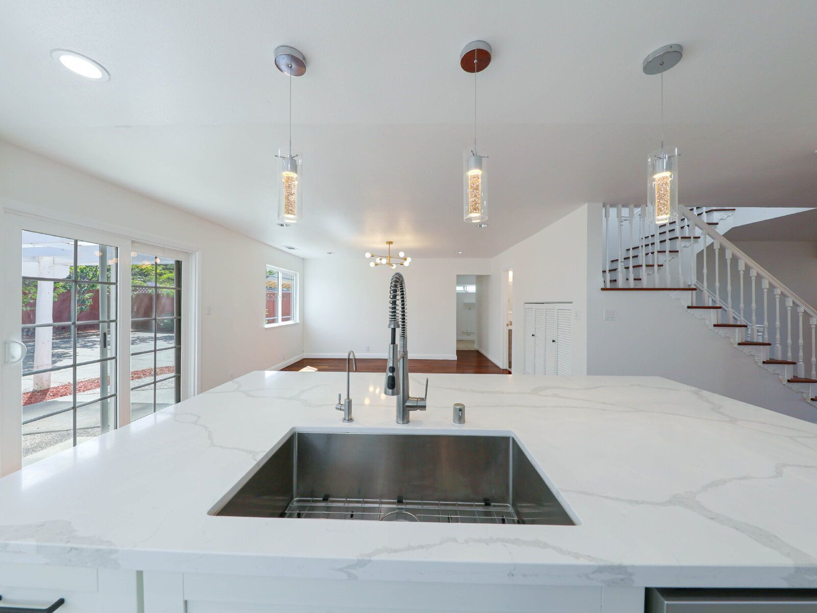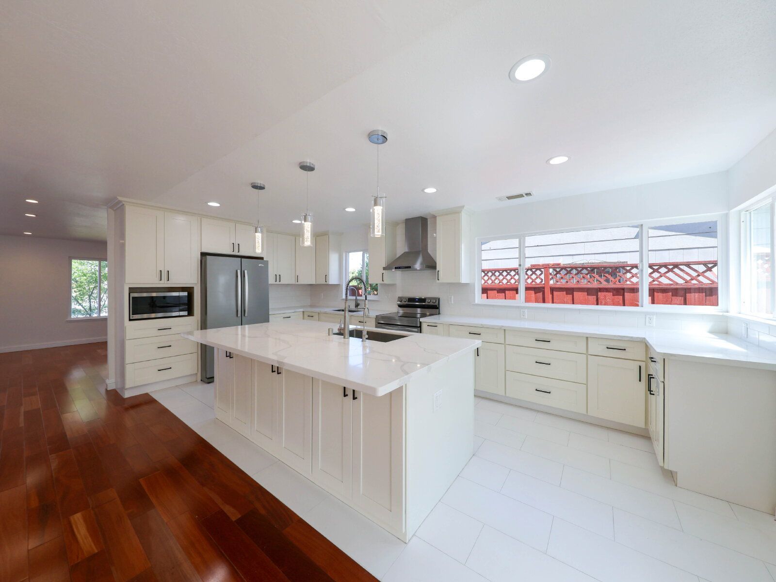 The open kitchen is built for everyday living, with a large island, quartz countertops, and stainless steel appliances.