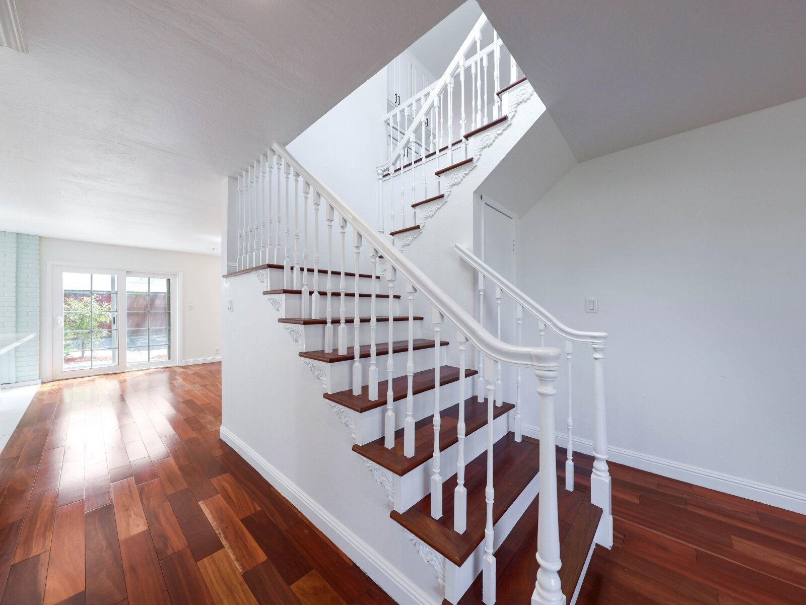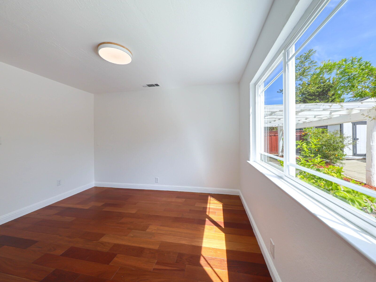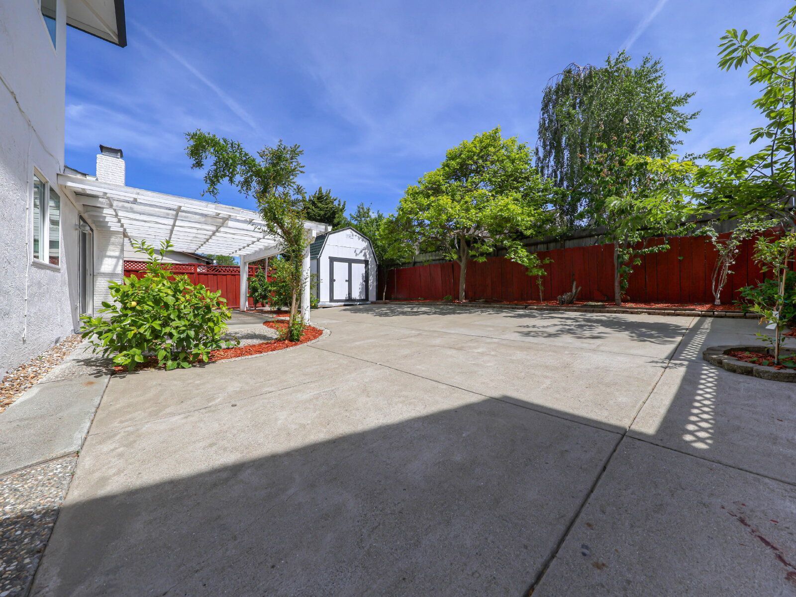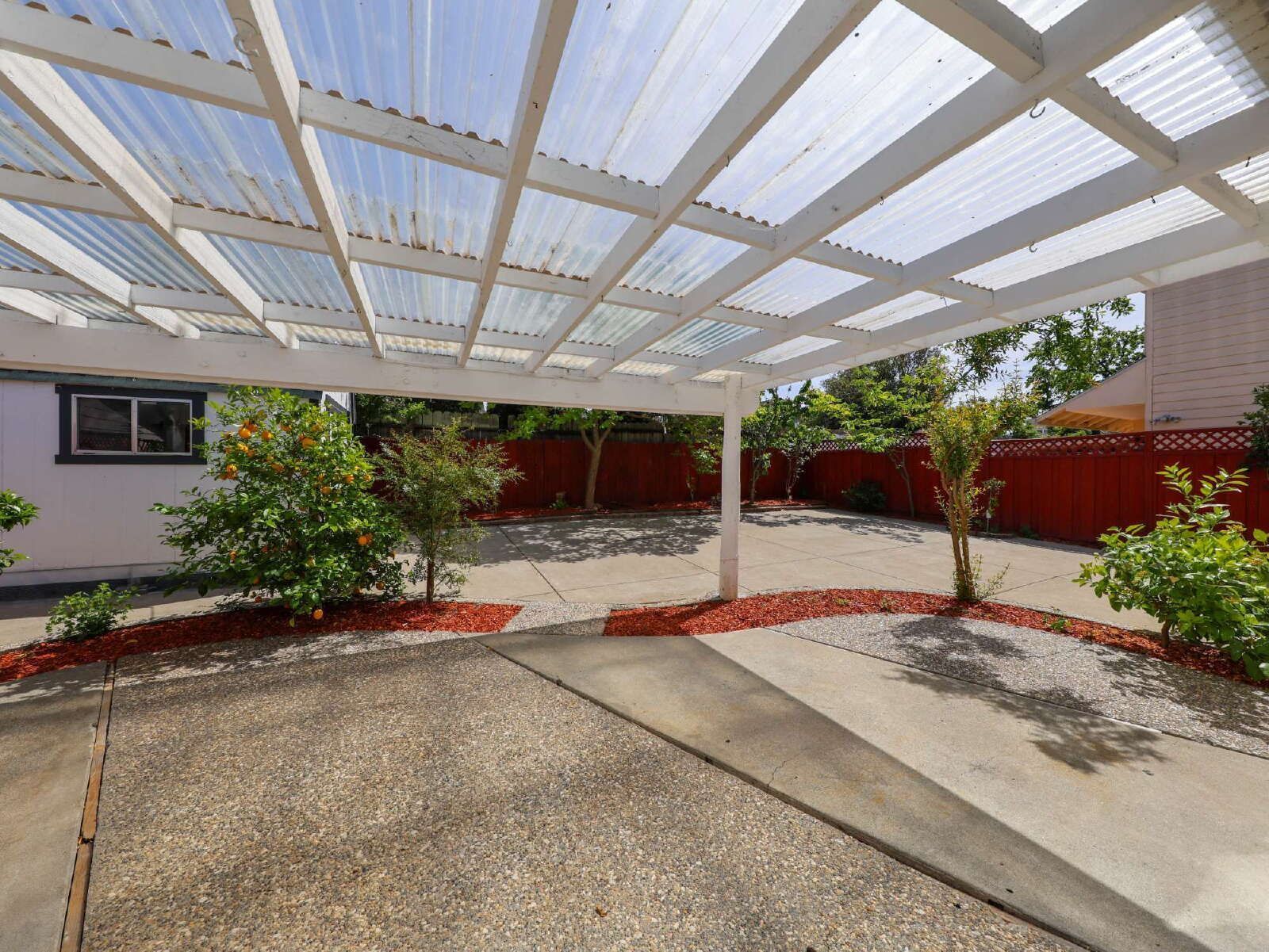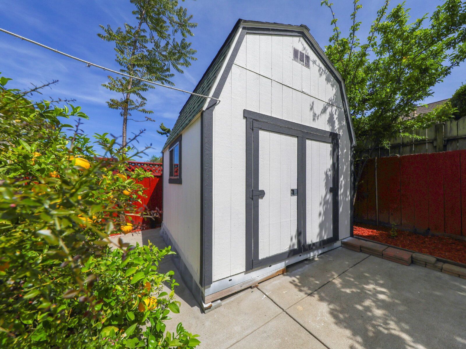 Enjoy a southeast-facing backyard with low-maintenance landscaping, mature fruit trees, and a peaceful outdoor setting.